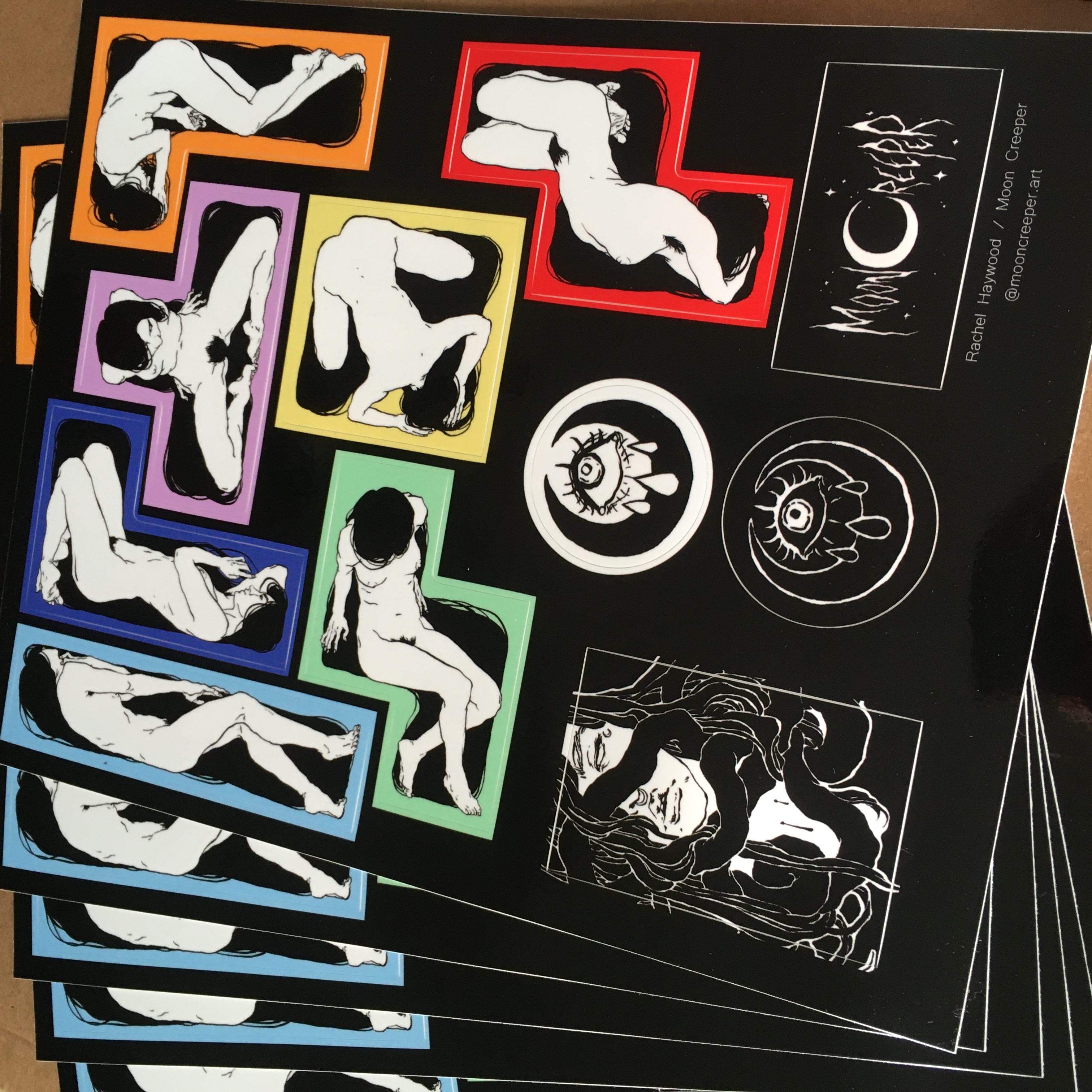 “Block Babes” Sticker Sheet 8”x10” 11 Glossy Vinyl stickers Includes 7 Block Babe stickers, and 4 Moon Creeper stickers. Great for sketchbooks, journals, walls, or wherever you slap your stickers at!